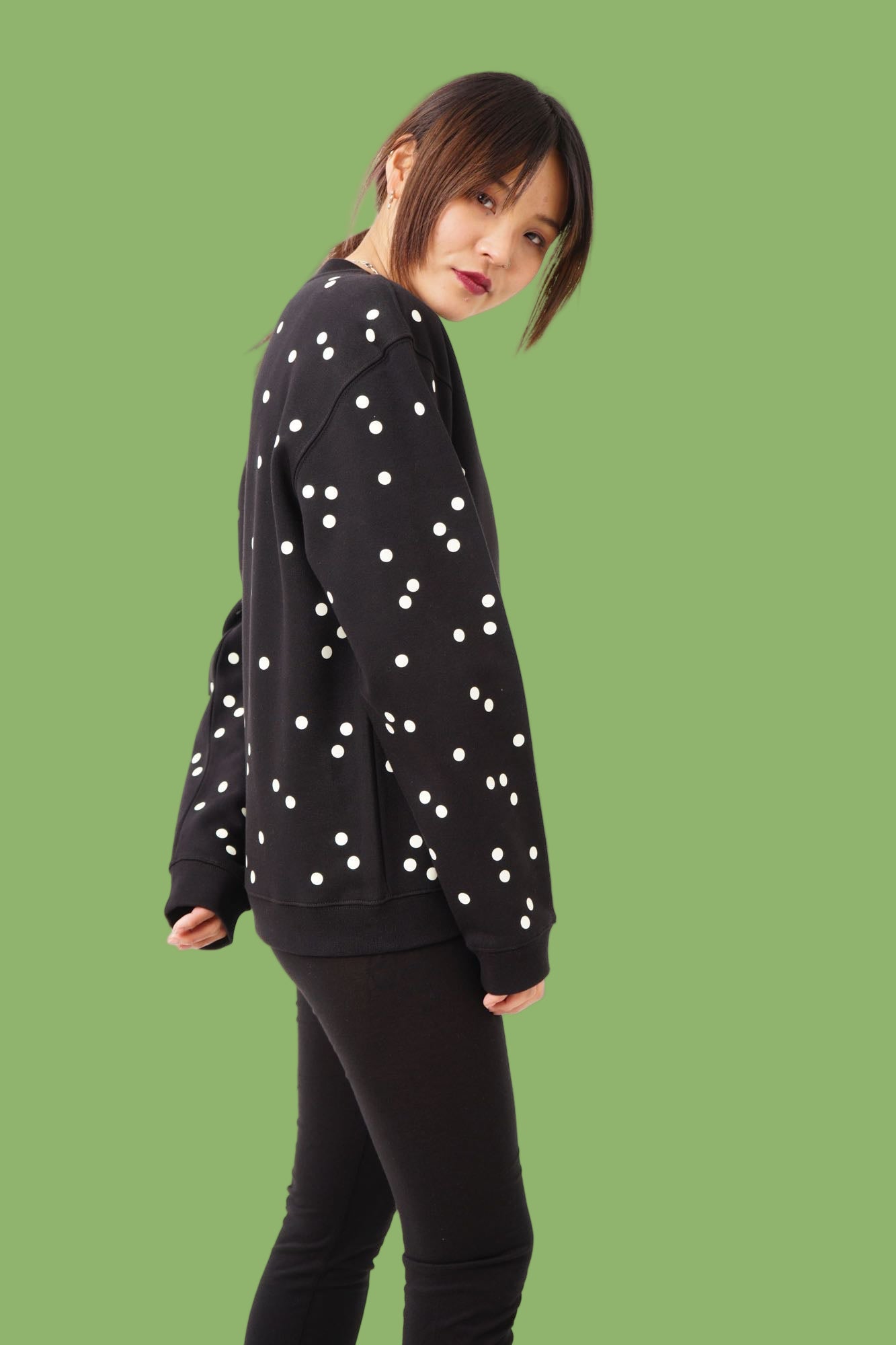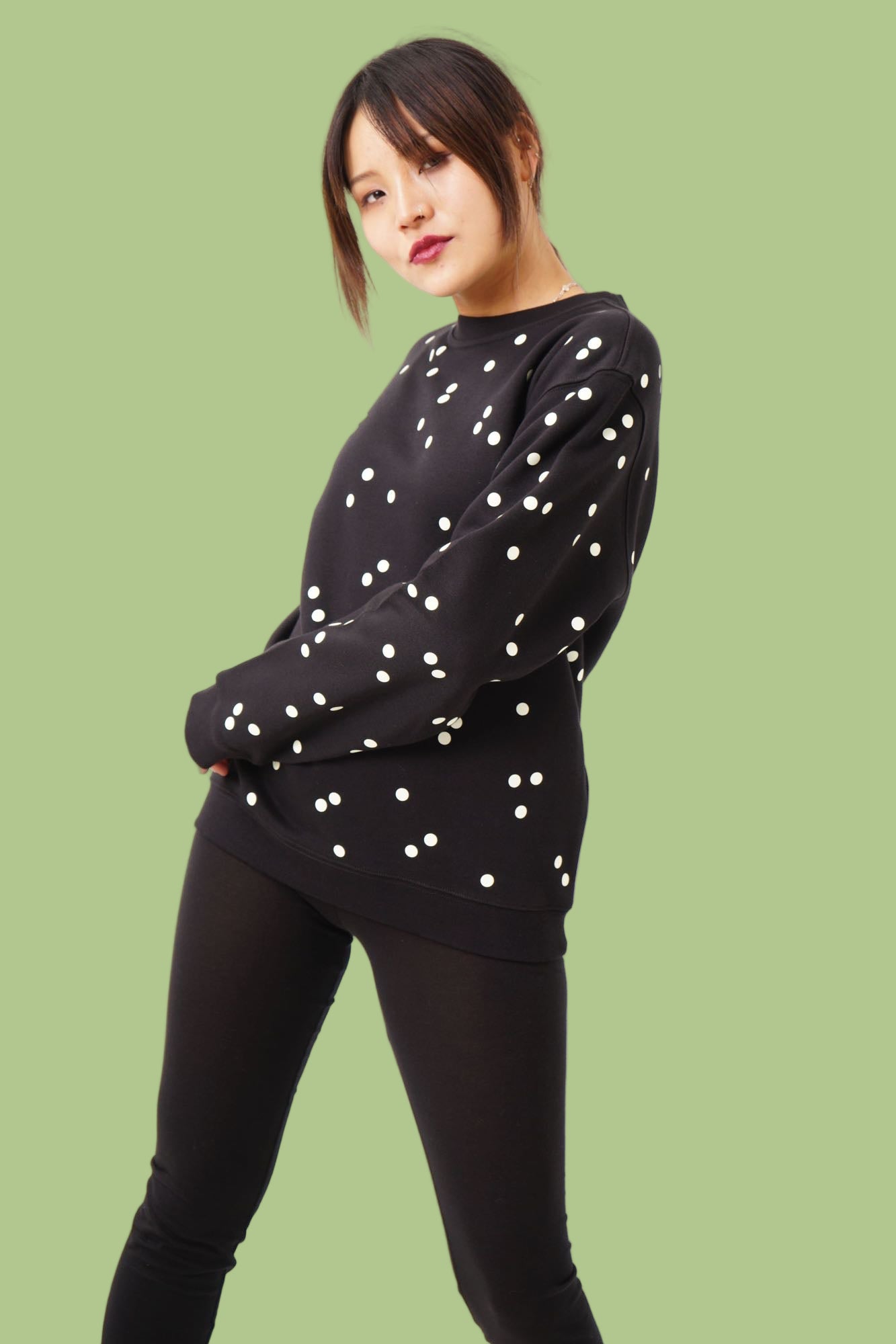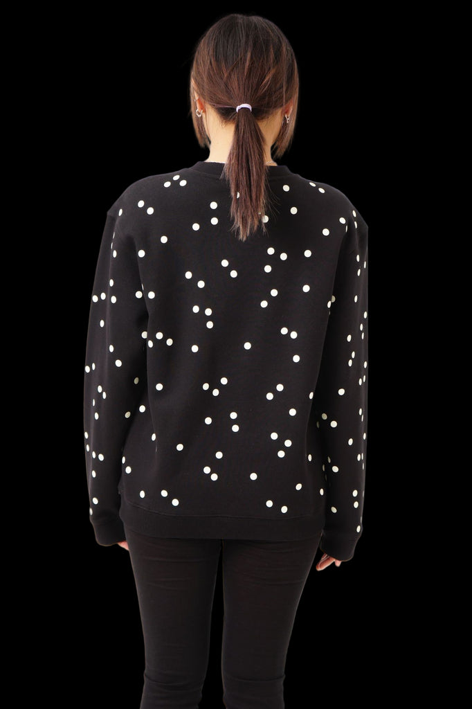 Light up the night in style with our Confetti Glow Sweater – the ultimate statement piece for anyone who loves standing out. This high-quality unisex sweater features an eye-catching scatter of dots in varying sizes across the entire design, creating a dynamic confetti effect that's as fun as it is fashionable. What makes this sweater truly special? The foil dots are embedded with glow-in-the-dark technology, transforming you into a walking light show once the sun sets. Perfect for evening adventures, festivals, or simply making a memorable entrance at any gathering. Handcrafted with care at our Berlin atelier, every single piece is one-of-a-kind – no two sweaters are exactly alike. This means you're not just wearing a sweater; you're wearing wearable art. The combination of meticulous craftsmanship and playful design makes it an instant conversation starter that celebrates individuality and creative self-expression. Comfortable, unique, and guaranteed to turn heads in the dark – this is the sweater that refuses to blend in.