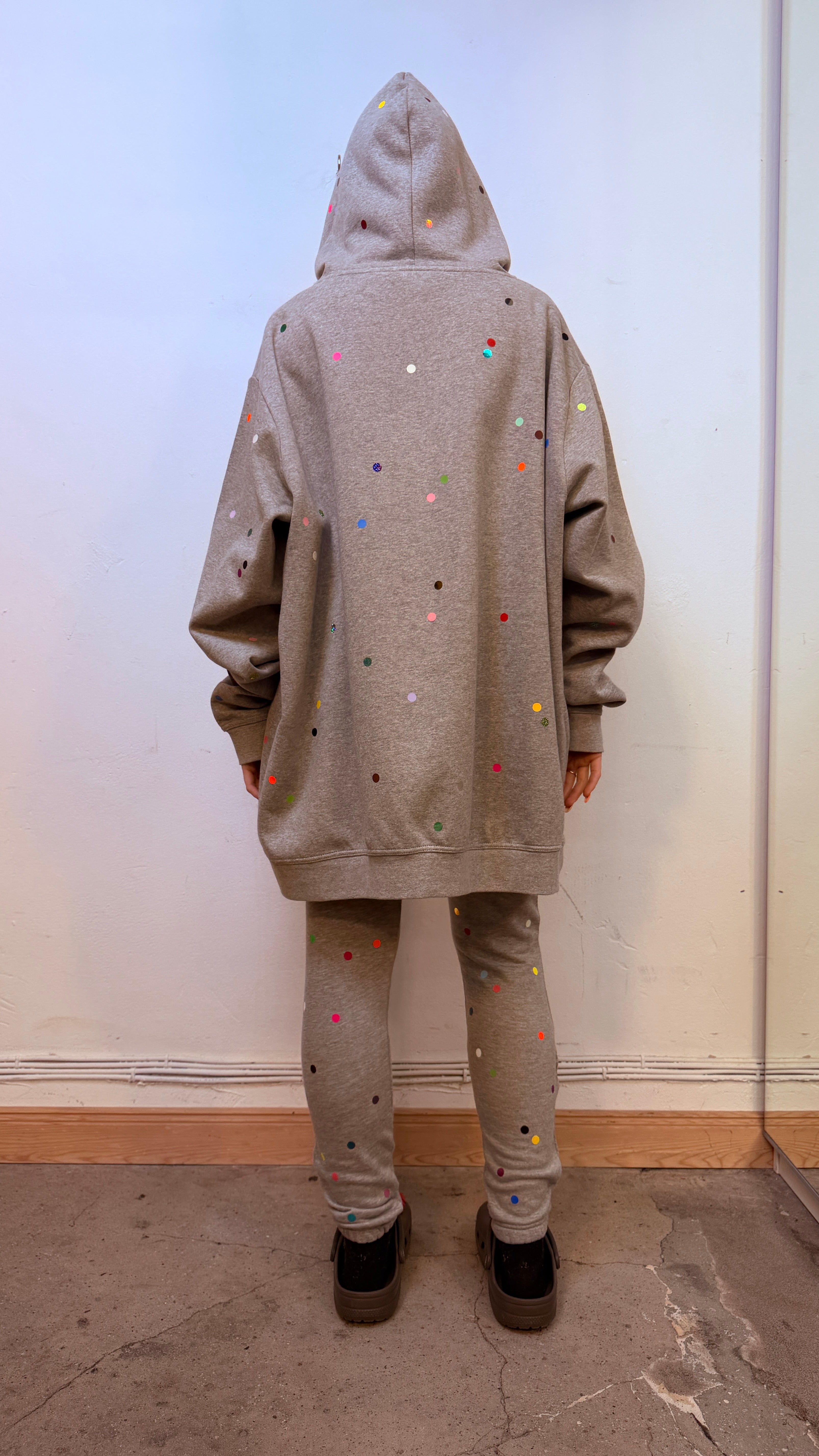 The Glitter Balls Track Suit dazzles with glow-in-the-dark, reflective prints, handcrafted with silkscreens and metallic transfers for a unique look. The Confetti Hoody, made in Berlin, features a high-quality, eye-catching confetti design with colorful, glossy, and reflective polka dots, creating a festive, one-of-a-kind masterpiece.