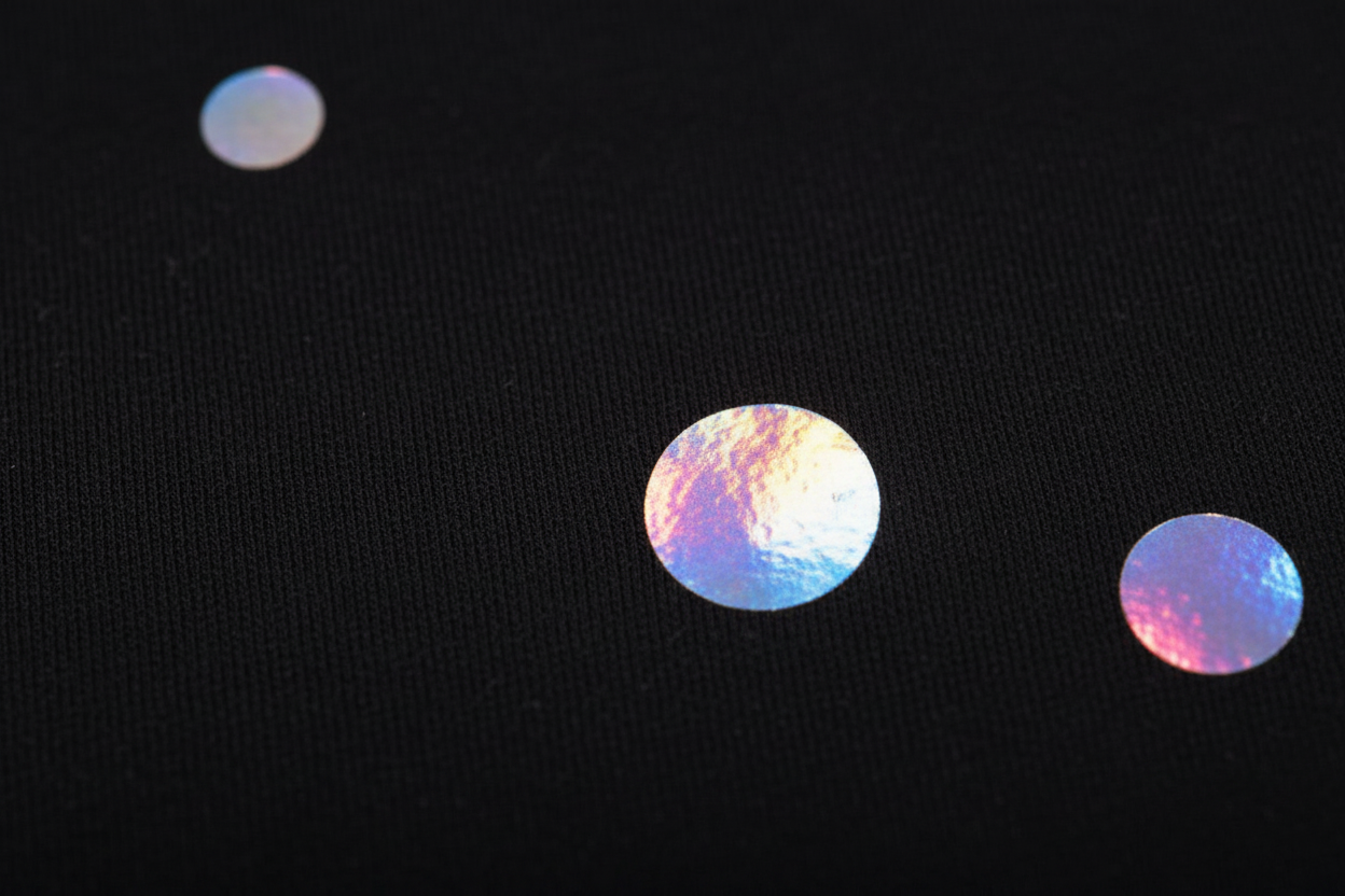 Inspired by the stars in the sky, the holographic foilprint dots of different sizes are carefully placed by hand in our atelier.