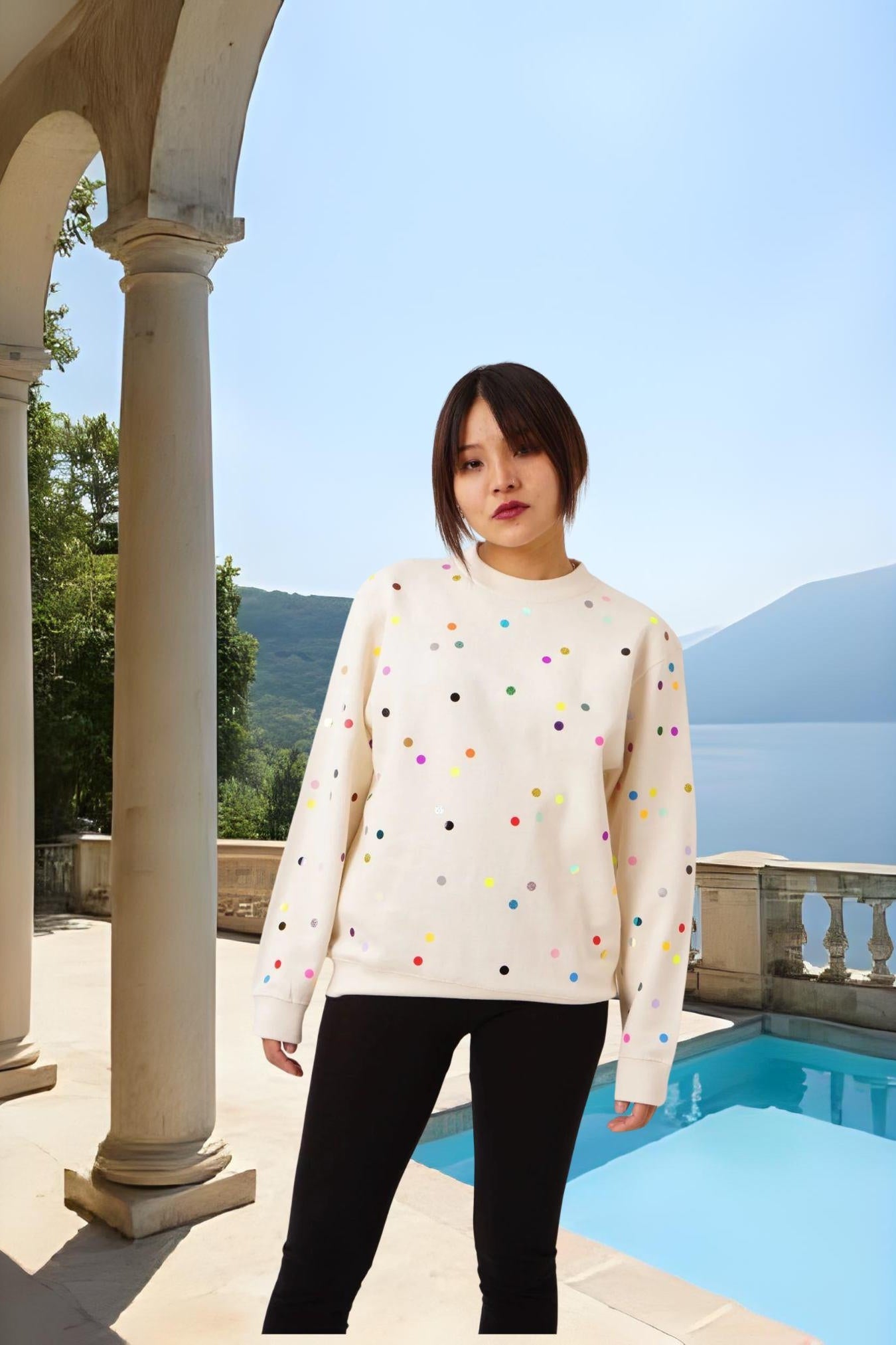 Step up your style game with our Confetti Sweater - definitely not your typical sweater! Crafted with precision and bursting with bold, multicolored mini polka dots that shine, reflect, and even glow in the dark, this piece commands attention. Its relaxed unisex fit delivers unbeatable comfort, making it your go-to for turning heads and sparking joy. Handprintd in Berlin, each Sweater is one-of-a-kind and guaranteed to electrify any crowd - get ready for your moment in the spotlight (and maybe a surprise confetti blast)!