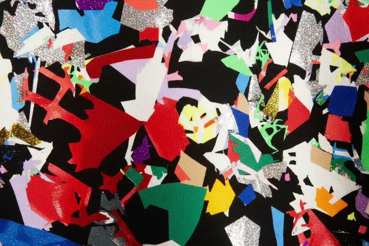 Comfy unisex joggers with rest foil pieces with loose ends like confetti all over. The layered pieces of foil create a second and third layer on top of the joggers.