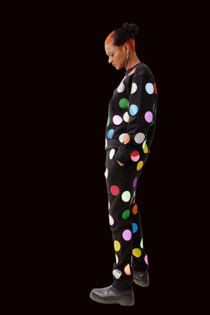 Unisex joggers with loads of wonderful multicolor glitter balls allover.
