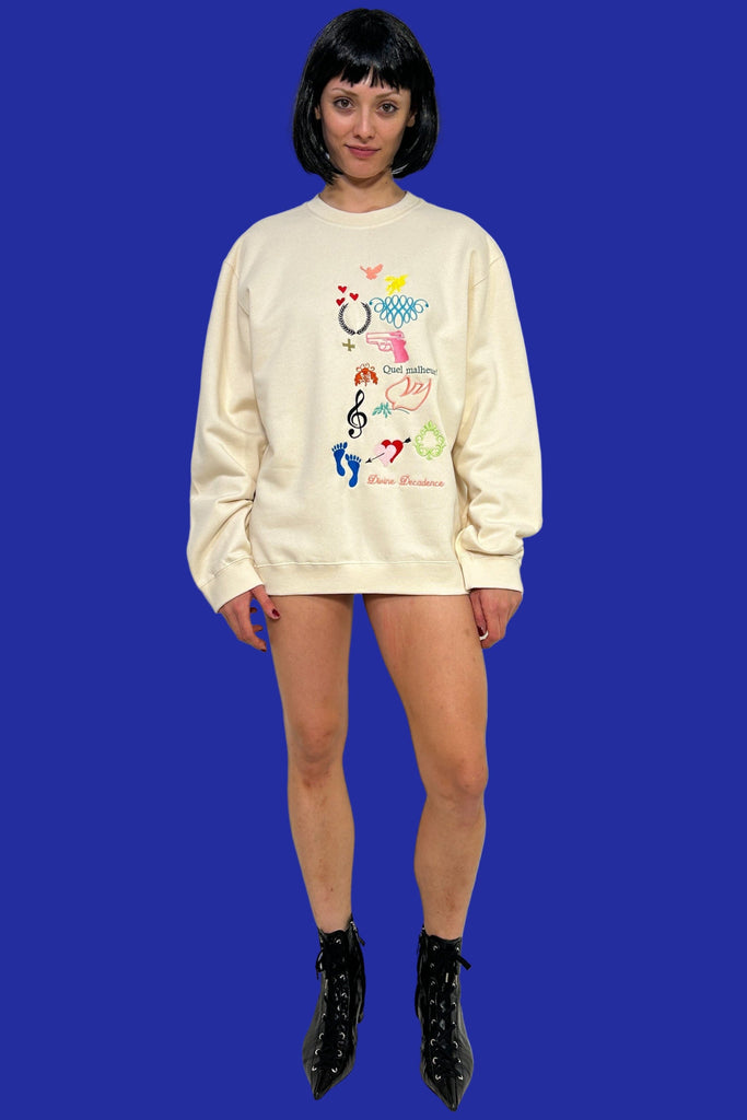 This reimagined classic from starstyling's archives gets a fresh spring-summer 2026 makeover with vibrant new colorways. Adorned with whimsical embroidered motifs including musical notes, hearts, delicate birds, and ornamental details, this sweater embraces its gloriously over-the-top kitschy aesthetic. Nothing to wear? Oh what a pity! Well now you do!